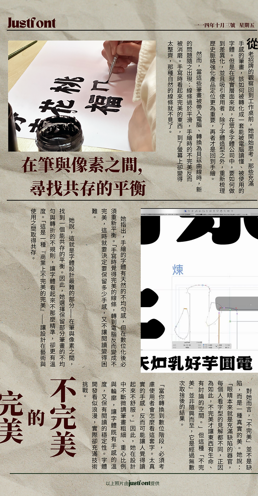 在《柑仔蜜》的創作過程中,沈采柔並不急著為這套字體貼上「台灣味」的標籤。她更在意的是為了找這套字,中間的文字造型脈絡,對她而言,設計不只是形的表現,而是一種內在的理解,那些筆畫、轉折與留白,最終都化成情感的延伸。